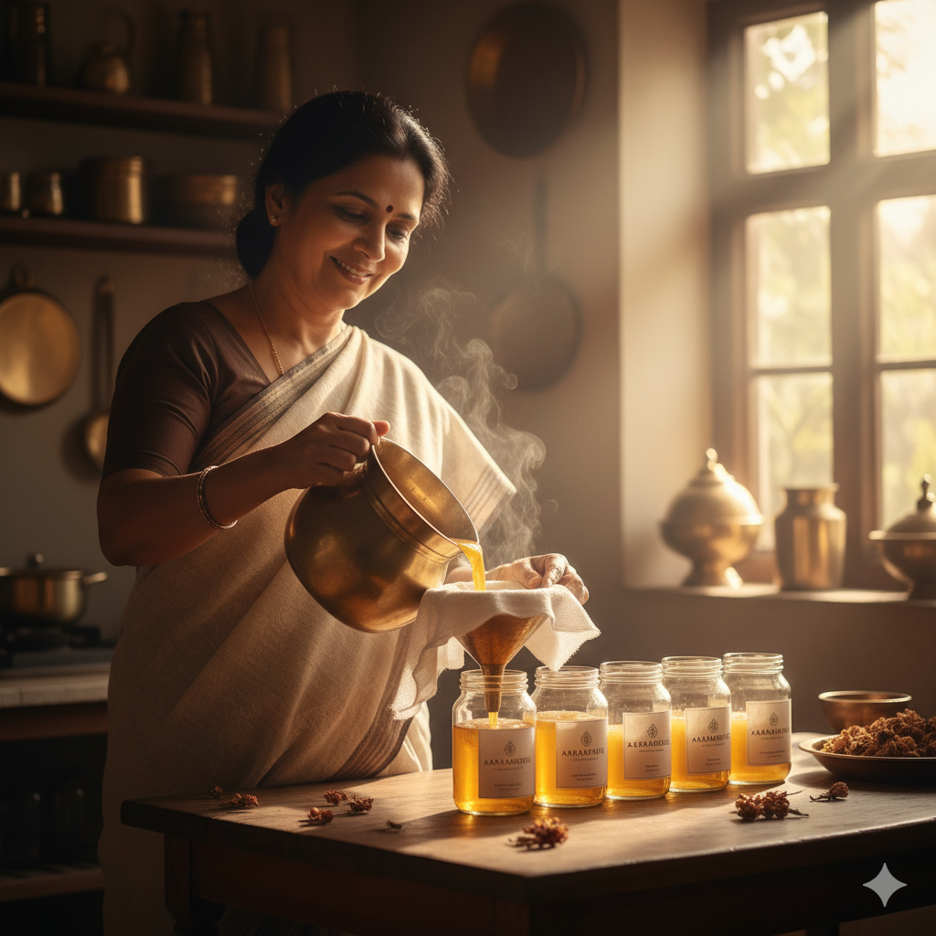 Packaging: The warm, filtered ghee is sealed in airtight, often glass, containers. This protects it from light and air, preserving its aroma, texture, and long shelf life until it reaches the consumer.