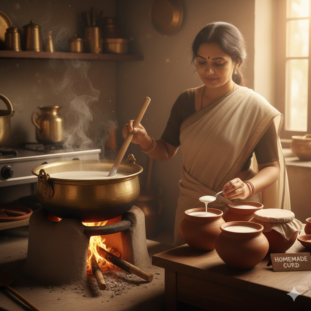 Heating milk and preparing curd is a simple yet delicate process that brings out the natural richness of dairy. The milk is first warmed gently until it reaches the ideal temperature—hot enough to activate the culture, yet not boiling, so that its nutrients remain intact. Once slightly cooled, a small amount of fresh curd is added and mixed evenly to introduce healthy bacteria. The mixture is then kept undisturbed in a warm place, allowing it to set gradually into smooth, creamy curd. This careful method ensures a naturally thick texture, a clean taste, and all the goodness of traditionally prepared dairy.